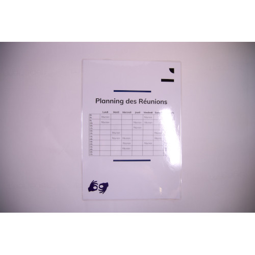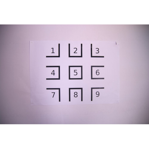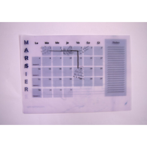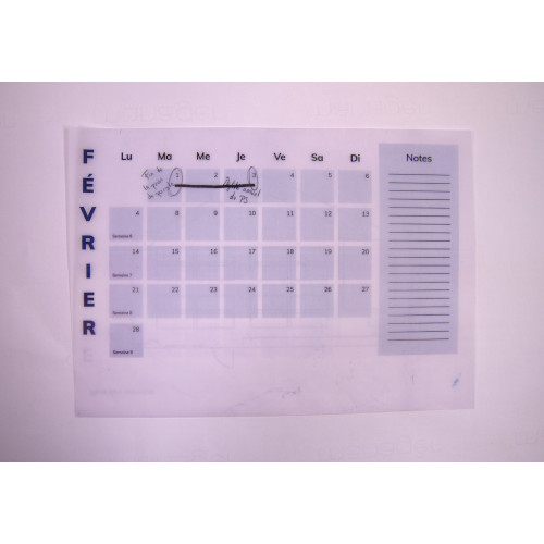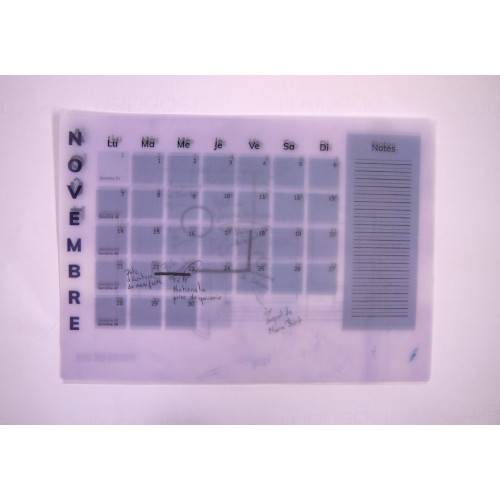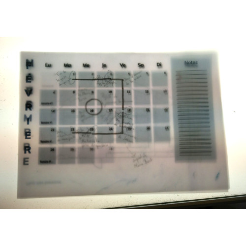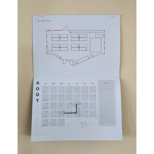 For this second puzzle, players are guided to a calendar for the year 2039, stapled to the wall. 5 out of 12 months show parts of signs. These were copied on slaps, dotted all over the room. To find them, the top location illustration shows a map with red crosses over the locations of the layers. This calendar only shows months starting from August so that not all parts of signs are visible and players are forced to search for layers. Their translucency allows them to be superimposed and to discover, by lighting from below, the desired shape. The calendar is made from machine papers printed and connected by a sewn thread.
