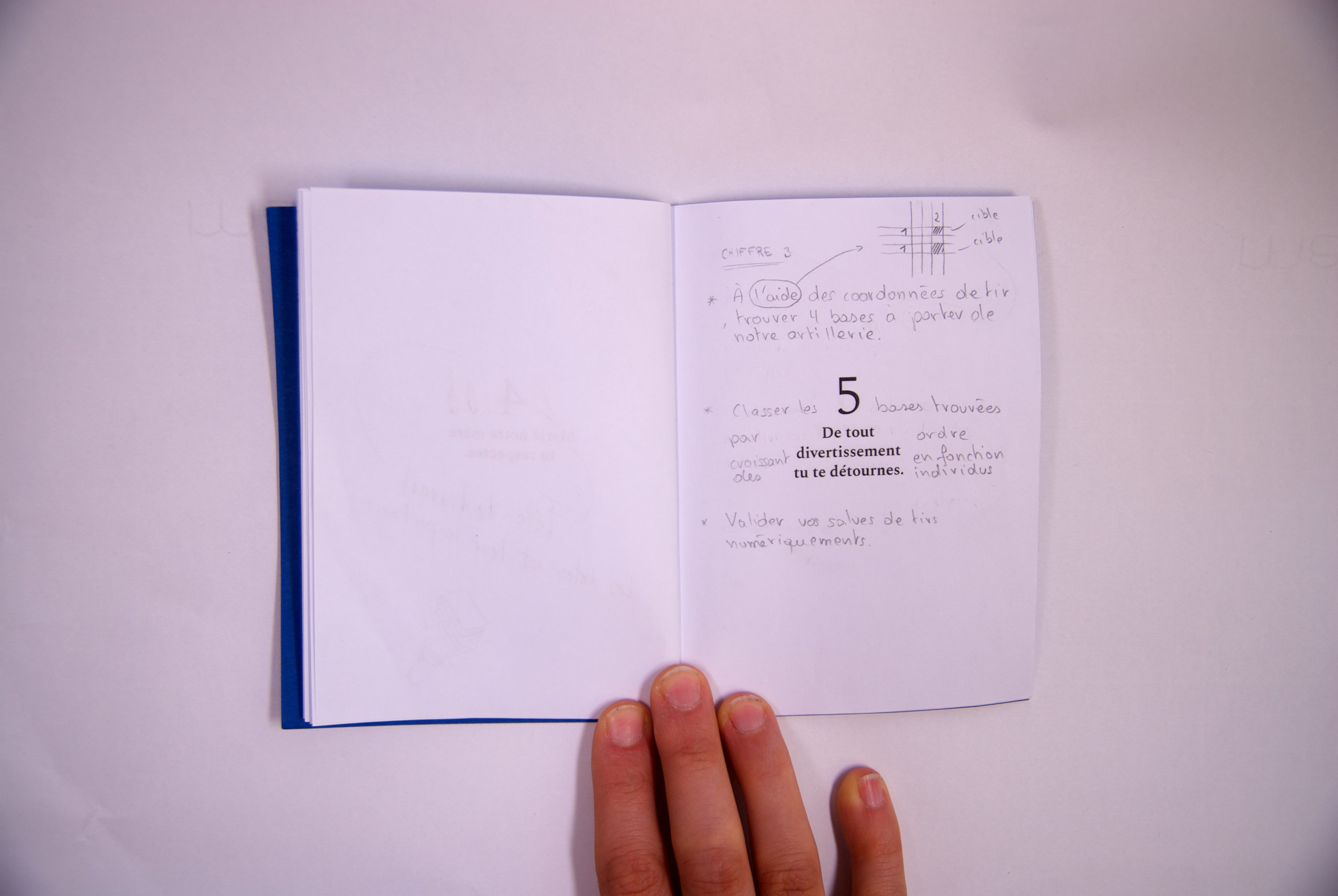 We then carried out a second test with people outside the project. They finished a game without too much difficulty. Nevertheless, players struggled with the third puzzle, which is complex. We also found that the protocol research step is not necessary. The little blue notebook can be given at the start of the game by the Game Master.