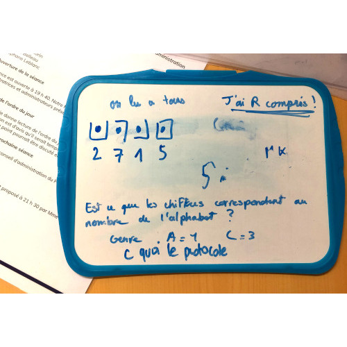 The principle is to succeed in finding 4 bases using the coordinates and indications of the protocol, to classify them in ascending order and then to transfer this order to the digicode in order to reveal the sign. This riddle was the most complicated of our escape game and the players were struggling to solve it. It should certainly have been simplified.