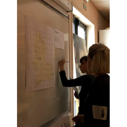 For the third riddle, we used a map. This one has, on its bottom, a grid with 4 coordinates, more or less large circles indicating the bases of the resistance according to their densities in population and an indication of its HQ. There is also a legend that explains the previous items. Next to it is a computer with a digital code made on Scratch.