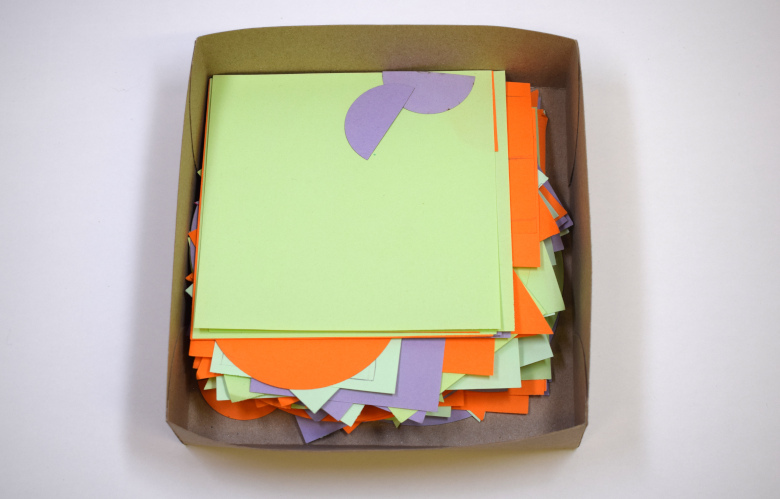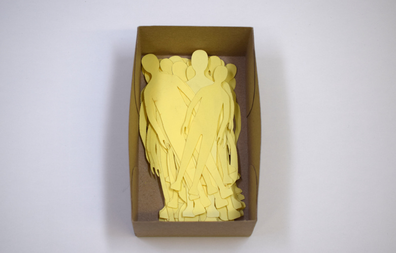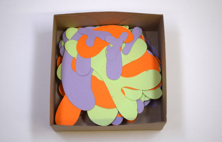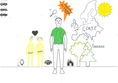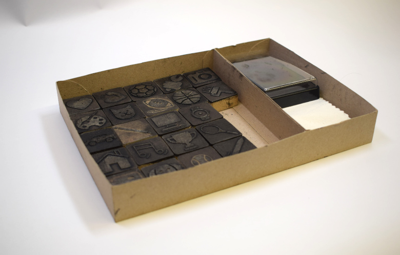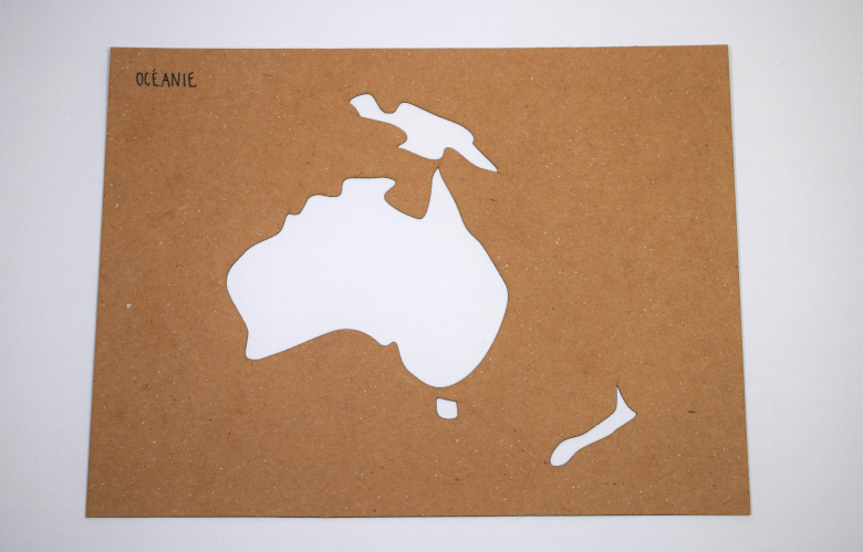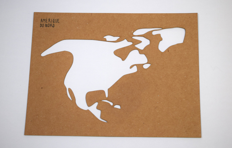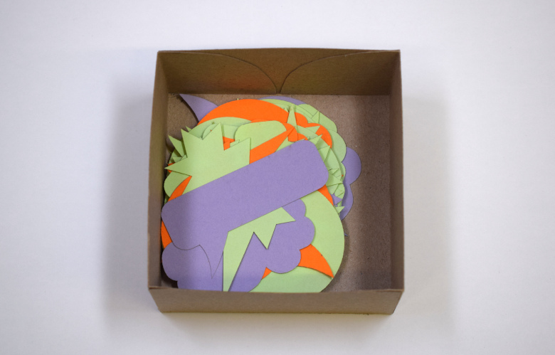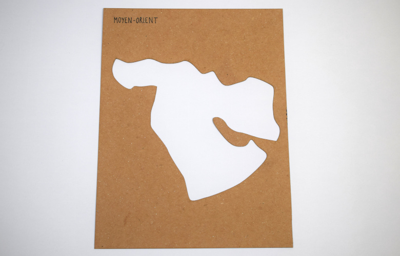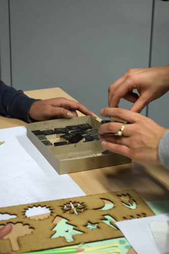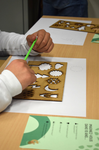 A fabric pouch has been designed for the participant presentation stage. It was intended to contain the first names of each. For the projection stage, a number of tools were available to users of the activity, intended to help them express themselves graphically to achieve their portrait by answering the questions in the protocol. There were stamps with pictograms depicting activities, stencils of parts of the world, normographs with landscape and weather elements, organic and geometric paper shapes, silhouettes of humans, comic speech bubbles , scissors, glue and pens. With these tools, they worked on an A3 sheet presenting a non-gendered silhouette and a horizon line. They could draw on the projection examples of the members of Tasse talkative.