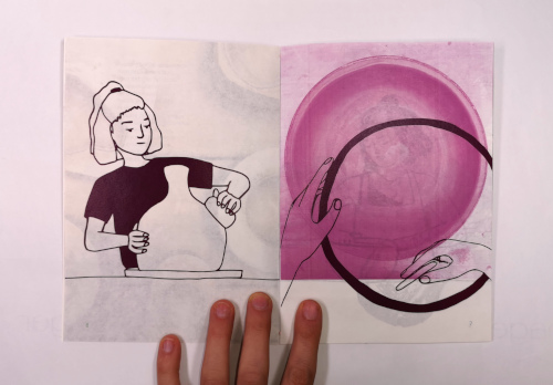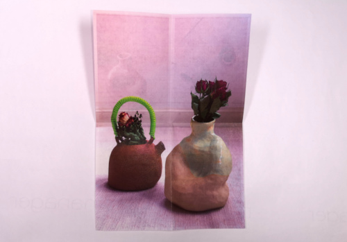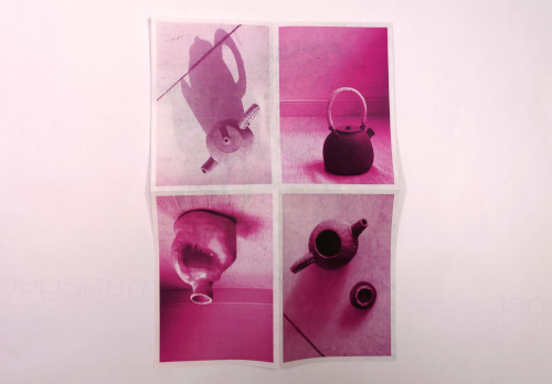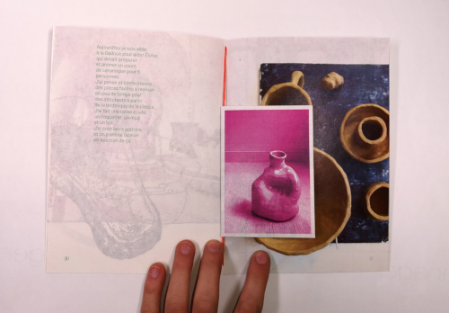 Another notebook is related to ceramics. It is connected by a thread and its dominant color is dark pink. Inside is a folded leaf, in images of a lighter pink.