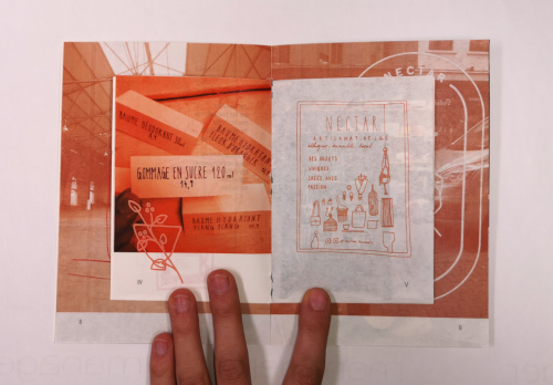 Then, a notebook discusses the daily events experienced during these courses. Its dominant color is light orange. In the middle of this edition is a smaller notebook colored with dark orange. It presents elements related to the Nectar store, a store run by Alyssia. These two notebooks are tied together by staples.