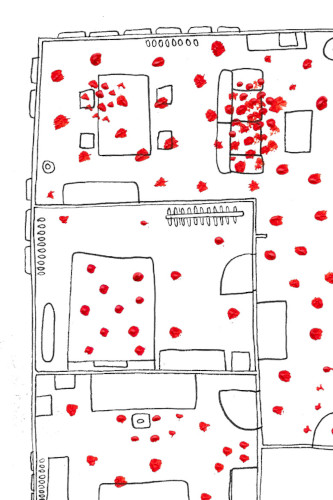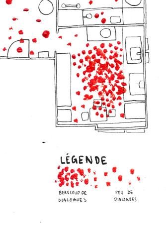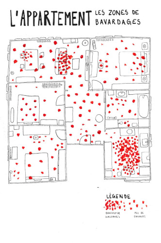 La carte de mon appartement représente les zones où je discute avec mes colocataires. Je l’ai créée à partir de feutres noirs et de peintures.