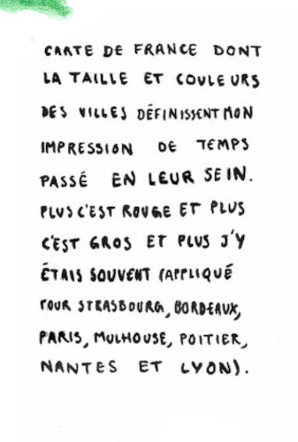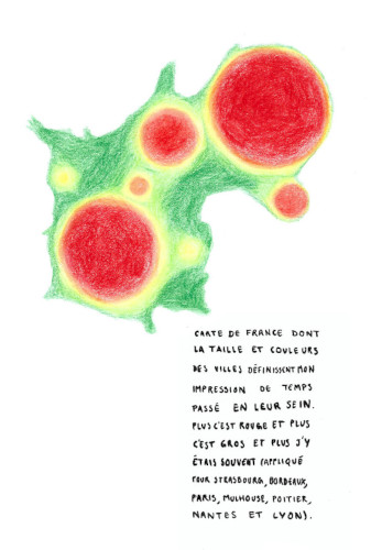 J’ai représenté la France selon les villes que j’ai le plus visitées. J’ai déformé le pays pour exprimer ce phénomène et créer une carte en anamorphose à partir de crayons de couleur.