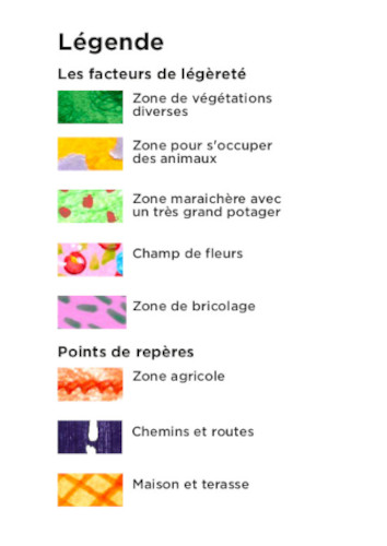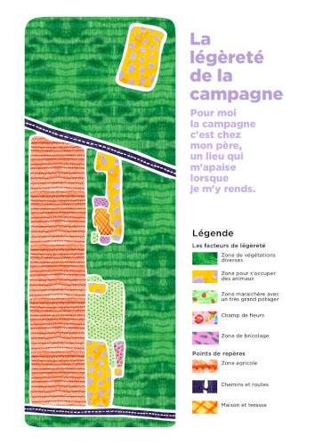 J’ai voulu décrire une campagne que je connais, soit la maison de mon père. J’ai axé cette carte sur tous les aspects qui rendent cet espace léger et agréable, entre végétations, animaux ou bricolage. Ceux-ci sont représentés par des figurés surfaciques réalisés à partir de différentes techniques plastiques (craies grasses, crayons de couleur, peinture, stylo bic, etc.).