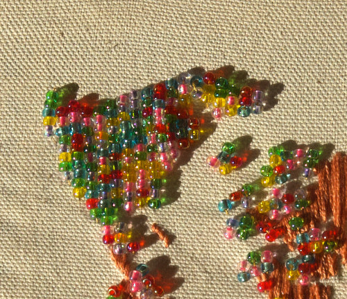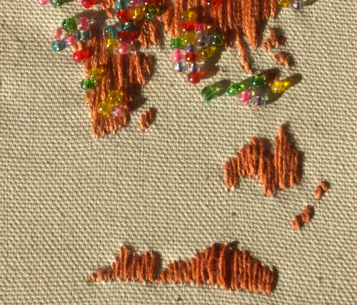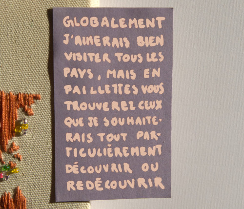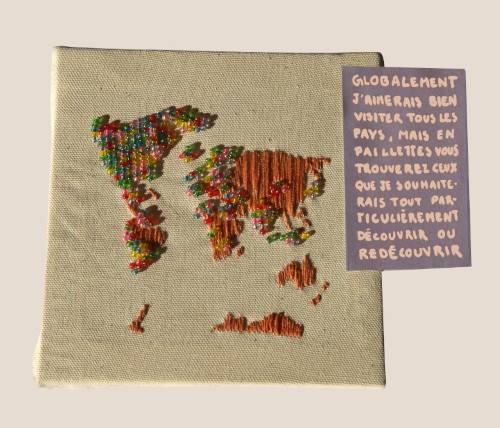 Pour cette carte, j’ai brodé le monde sur une toile de coton. Les parties en perles correspondent aux lieux que j’aimerais le plus visiter.