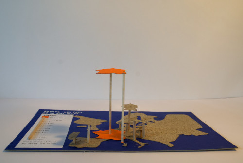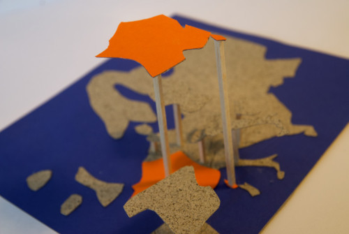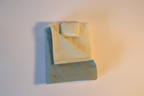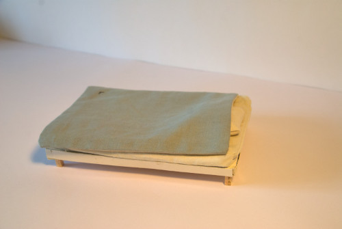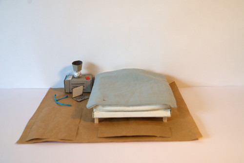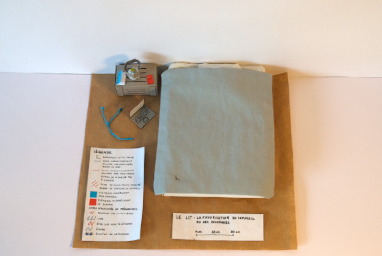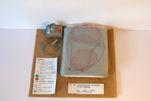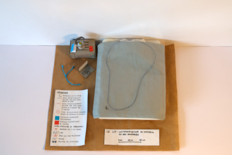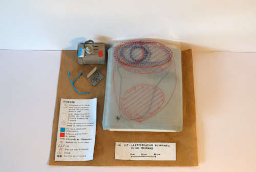 C’est ce phénomène que j’ai voulu présenter dans ma carte, à partir d’un système de calques modulaires, qui se superposent sur une maquette de mon lit. Celle-ci est réalisée à partir de cartons collés depuis des développés, de papiers contrecollés sur du carton, de tissus cousus et de riz pour rembourrer mon matelas et mon oreiller. Les calques modulaires sont des parties de pochettes transparentes découpées sur lesquelles j’ai cousu.
