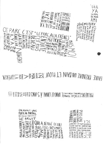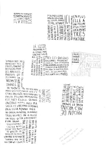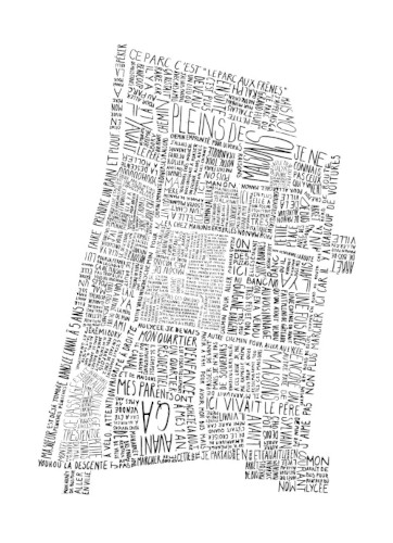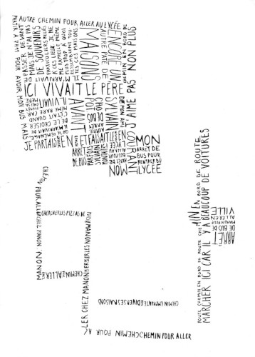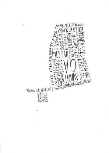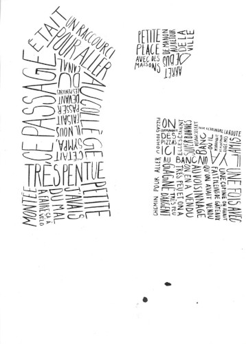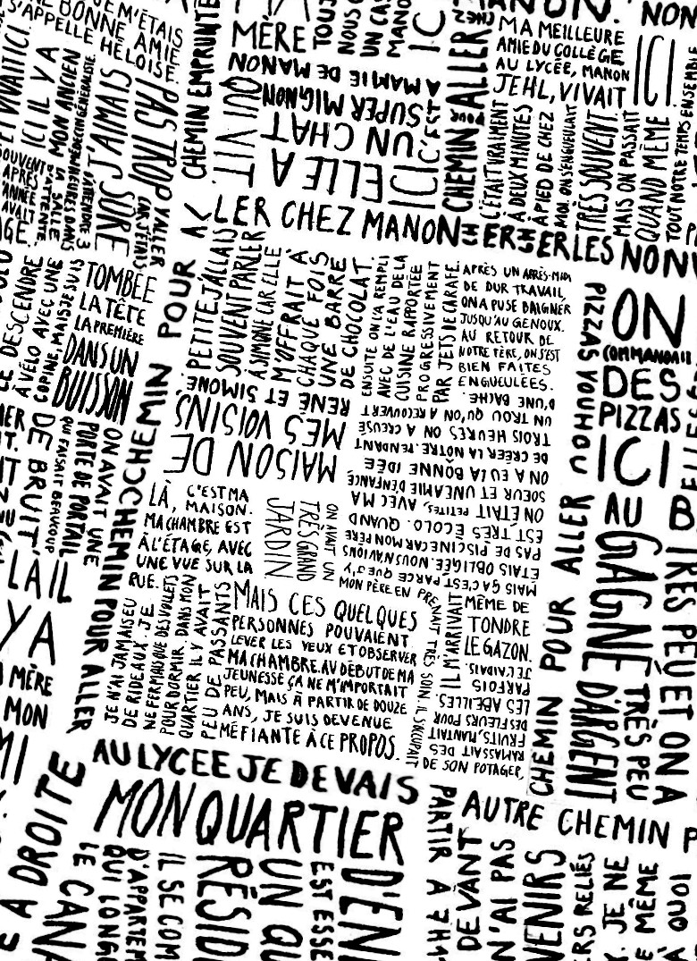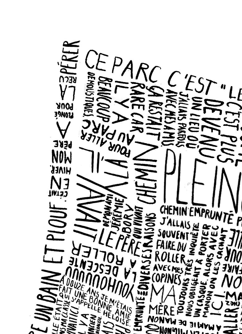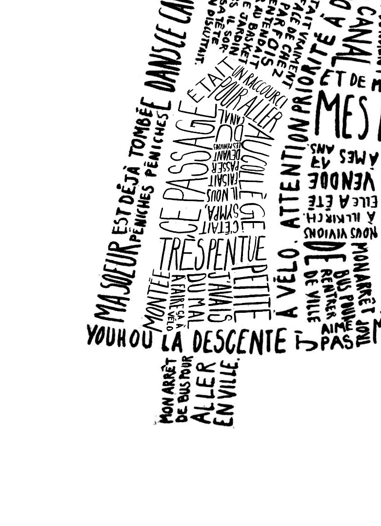 Pour cette carte, j’ai décidé de présenter mon quartier d’enfance, dans lequel je ne vis plus depuis mes 18 ans. Celui-ci se dessine à partir de souvenirs écrits à l’encre de Chine. Ceux-ci sont scannés puis situés selon un plan des lieux vu de haut. Le résultat final s’imprime sur un format A3.