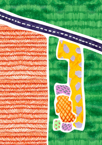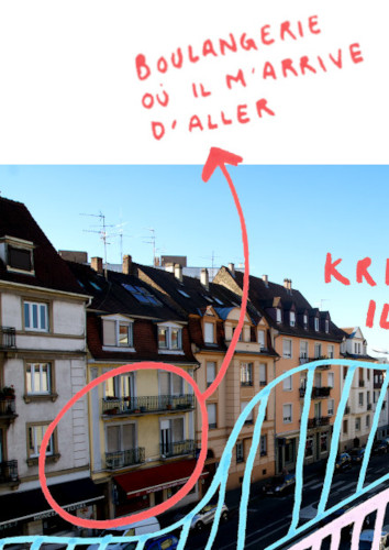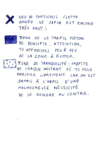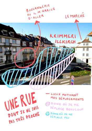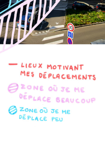 Je me déplace peu dans ma rue. C’est ce que j’ai voulu représenter dans cette carte, qui correspond à une photographie annotée aux posca.