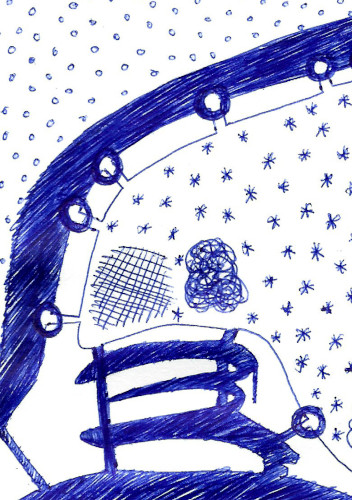J’ai voulu montrer, à travers cette carte, que nous ne sommes qu’une infime partie de l’univers. Pour faire cela, j’ai utilisé la technique de la linogravure.