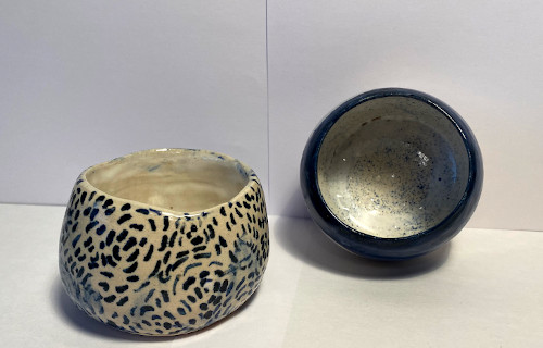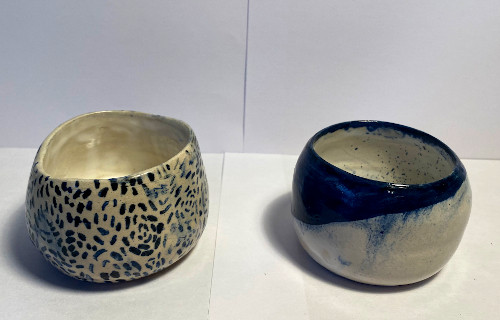 Ces tasses à café ont été réalisées au tour. Elles ont ensuite été émaillées avec du bleu de cobalt et un émail transparent.
