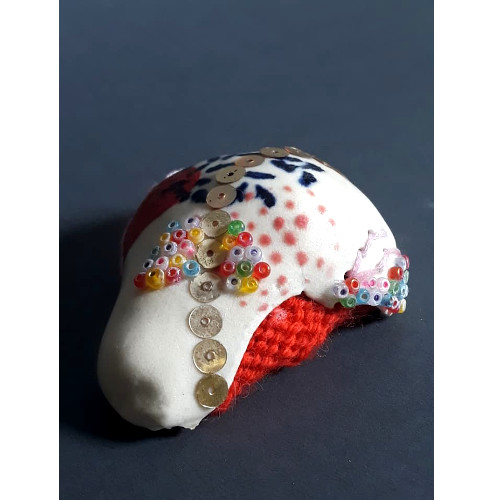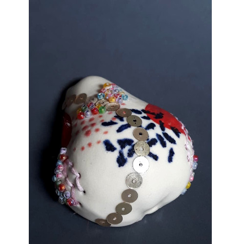 Ces deux céramiques sont obtenues à partir de coulage de faïence dans un moule en plâtre. Celui-ci tient sa forme d’une poire. J’ai voulu explorer l’alliance de matières en liant leur surface émaillée et lisse à des fils tissés ou brodés et des perles et sequins collés.