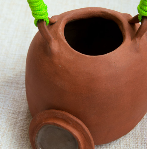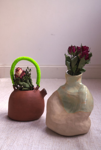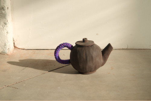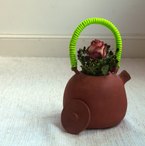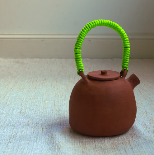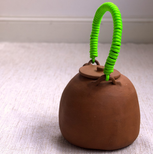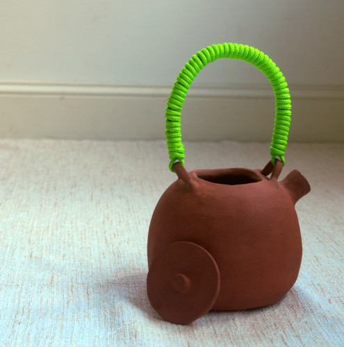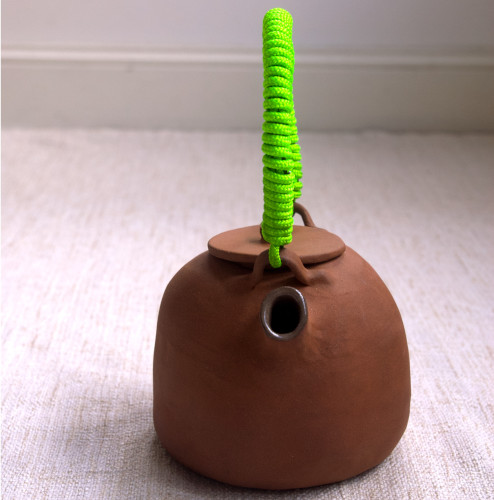 Cette autre théière est réalisée à partir d’une terre rouge et de la technique du colombin. Elle est émaillée à l’intérieur avec un émail transparent. Son manche se compose de fil de fer et d’une corde verte fluo.