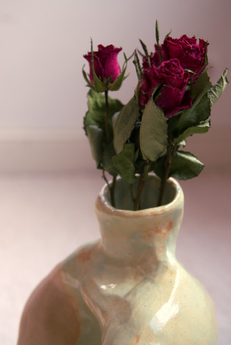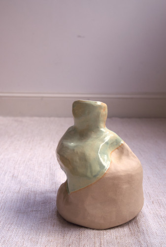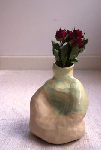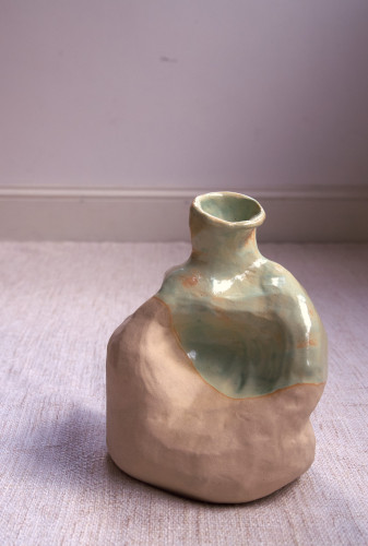 Voici un vase en céramique créé à partir de la technique du colombin, puis déformé par des pincements de main. Le dessus est émaillé avec un émail melon.