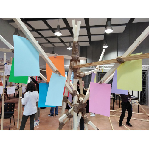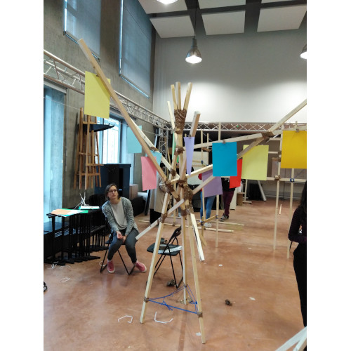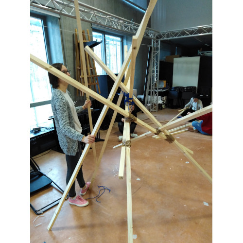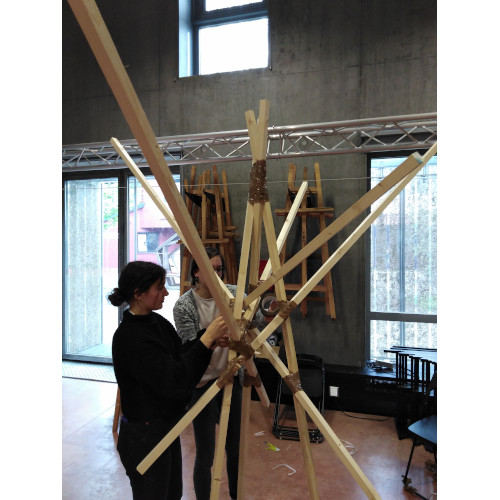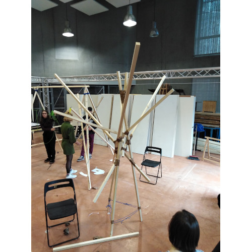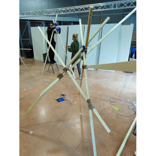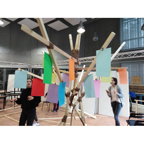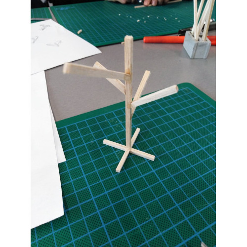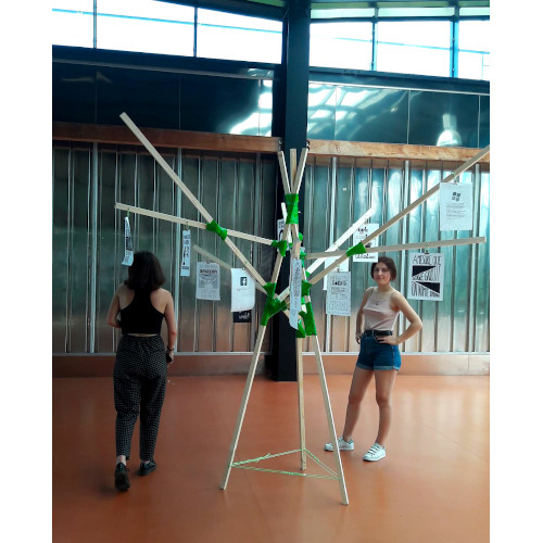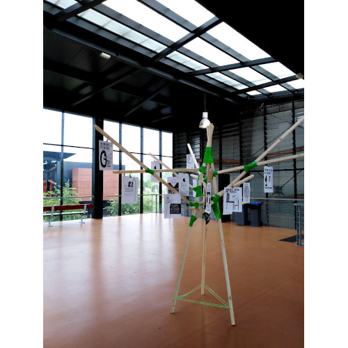 Après avoir exploré différentes idées et réalisé quelques maquettes, nous nous sommes accordés sur une structure inspirée d’un arbre. Cette composition permet d’obtenir un support équilibré. Nous pouvons tourner autour de son centre et y observer les différentes affiches.