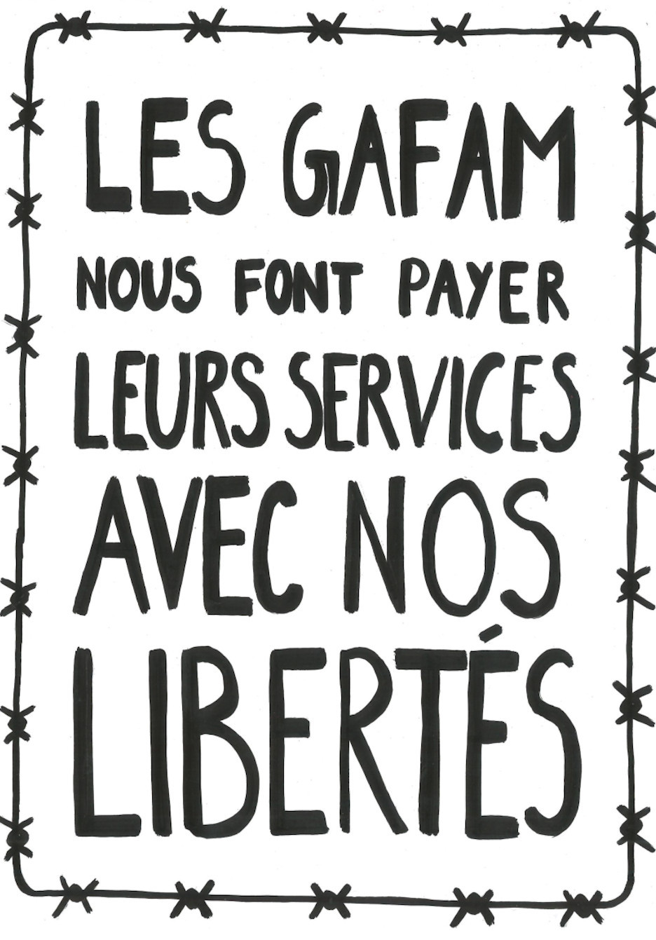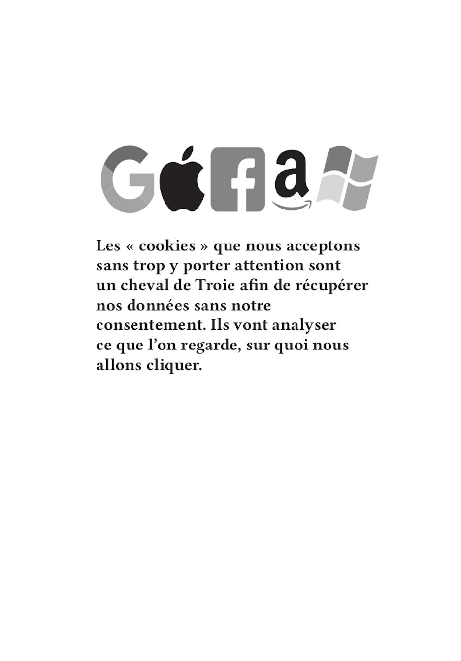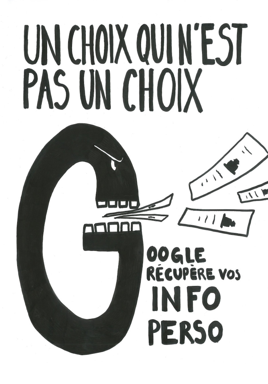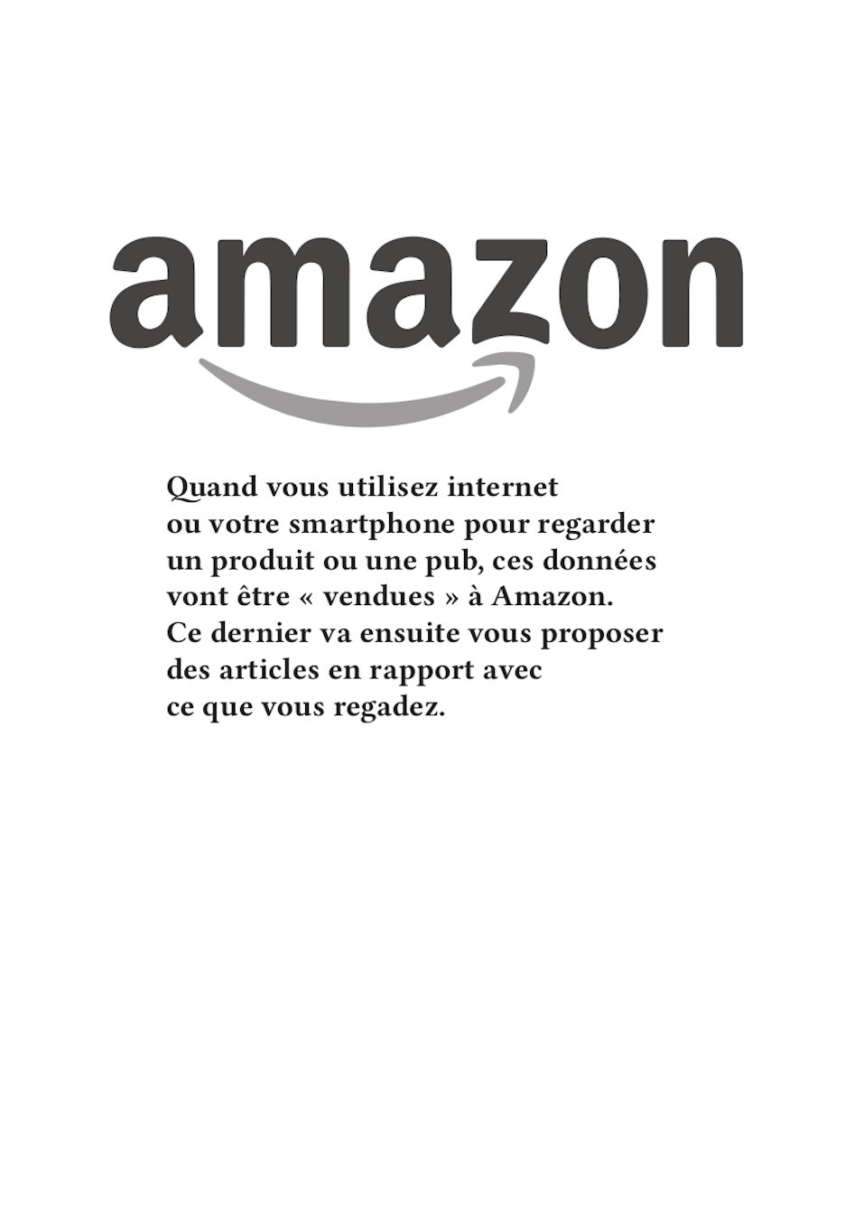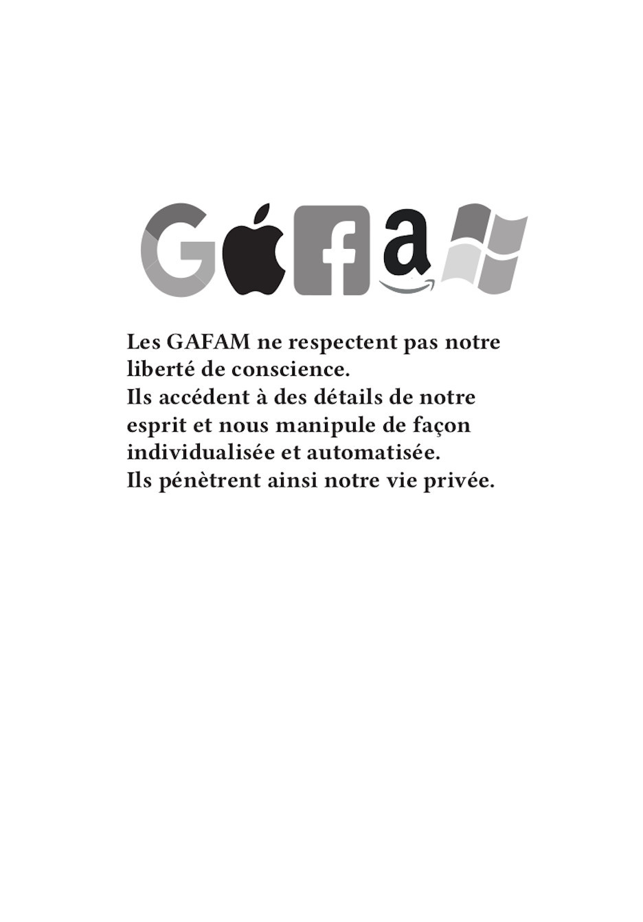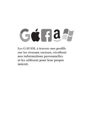 Nos publications traitent des travers des GAFAM (Google, Apple, Facebook, Amazon, Microsoft). En nous inspirant particulièrement du graphisme militant de mai 68, nous avons réalisé 16 affiches. Au recto, elles présentent une illustration expressive, souvent accompagnée d’un slogan simple et mémorisable. Au verso, elles détaillent plus amplement la dénonciation faite.