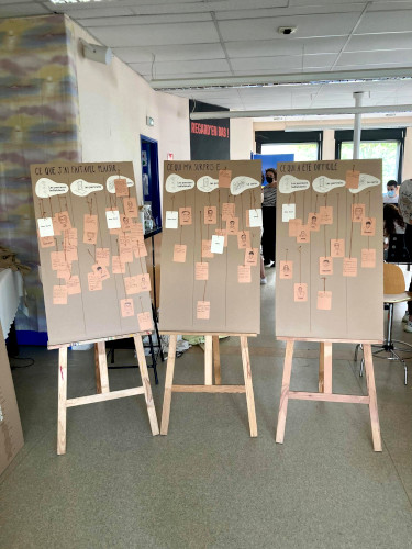 Ils ont bénéficié de trois panneaux en carton pour exposer leur opinion, avec à chaque fois trois colonnes, pour donner les trois grandes étapes du projet. Il avaient des étiquettes avec leur portrait dessus, pour relier l’avis à une personne, un stylo noir pour écrire ou dessiner et des fils et clous pour accrocher les étiquettes.