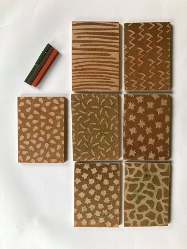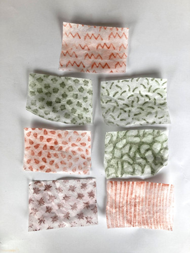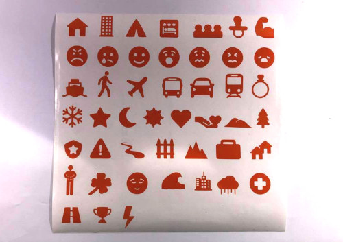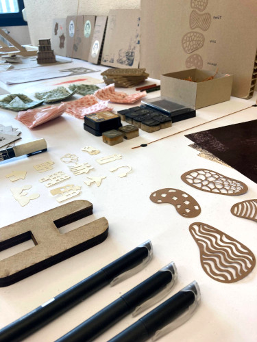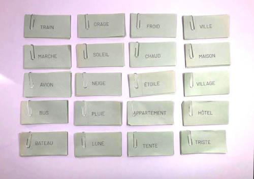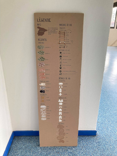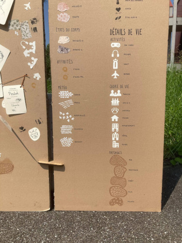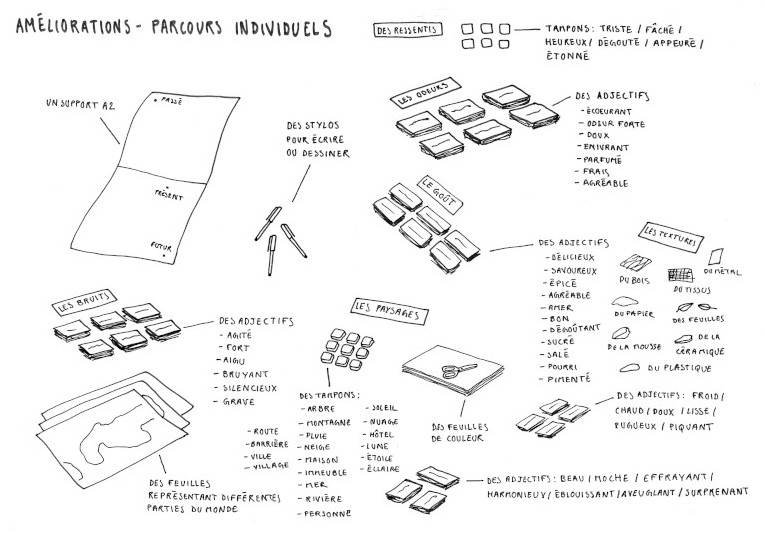 Ainsi, chaque participant du projet dispose d’une légende en papier où il peut écrire dessus, de deux étiquettes, de fils, de papiers de soi avec des traces colorées dessus pour exprimer ses ressentis, de papier avec des traces de densité différentes pour exprimer ses états du corps, de tampons pour exprimer ses affinités et ses actions de vie, de trames à tracer pour parler de la météo et de formes en papier à coller pour parler de ses activités, de son cadre de vie et du paysage. Chaque personne peut aussi écrire, dessiner et coller des dessins qu’il a fait.