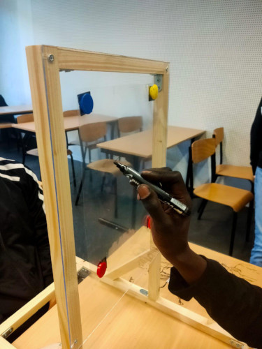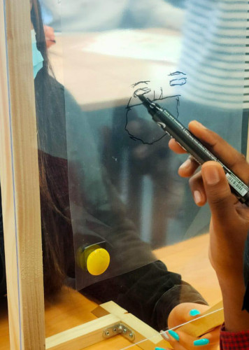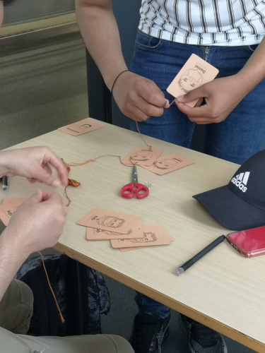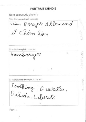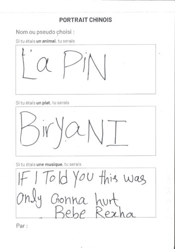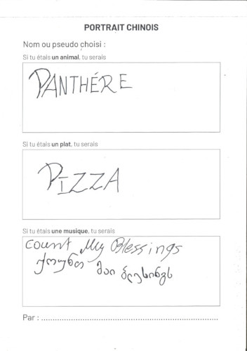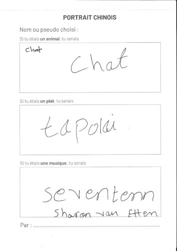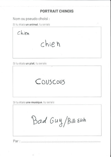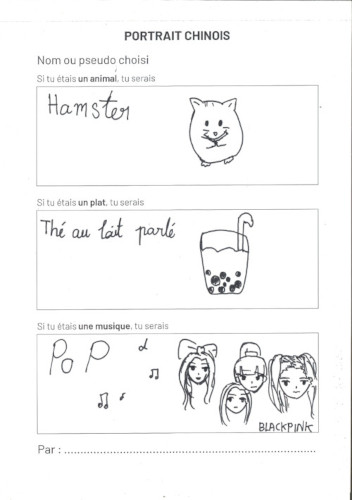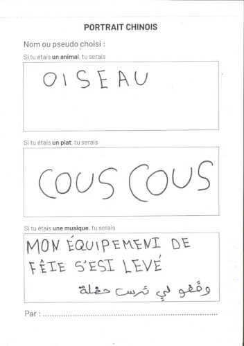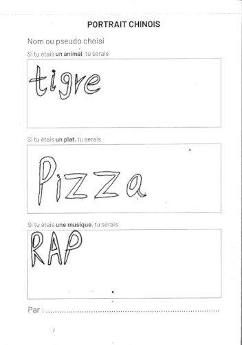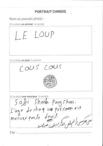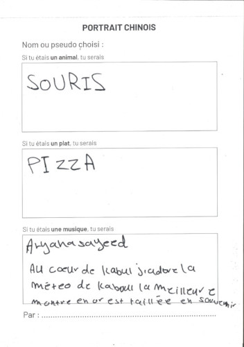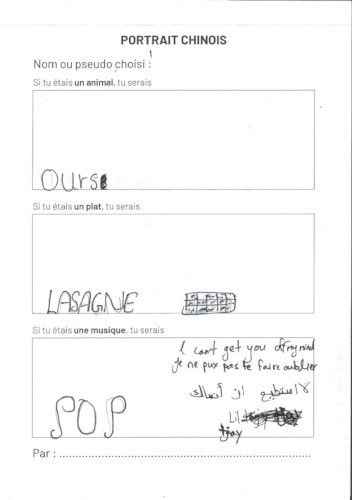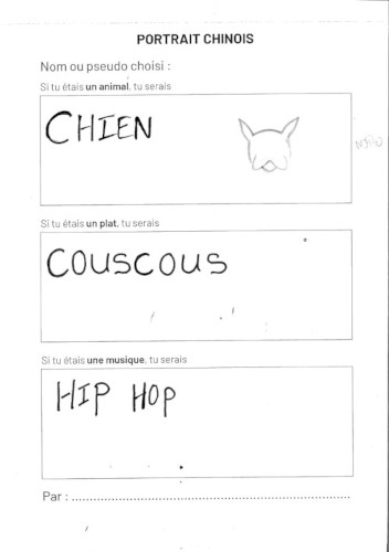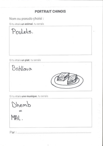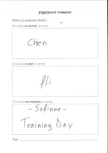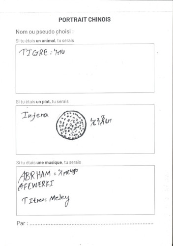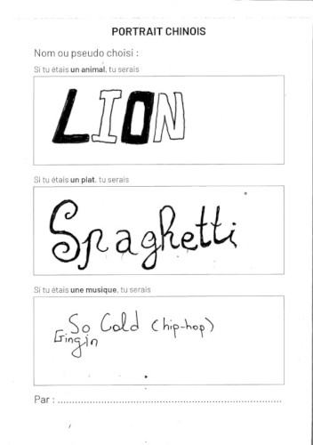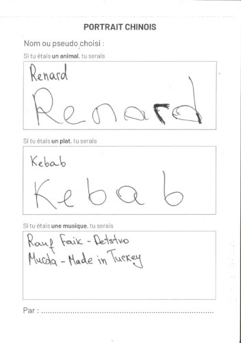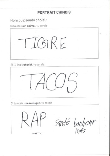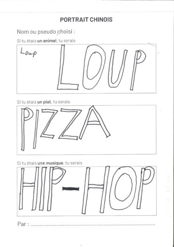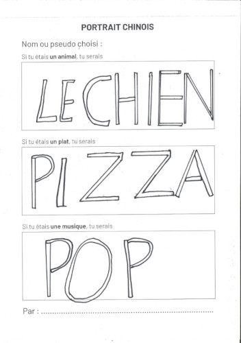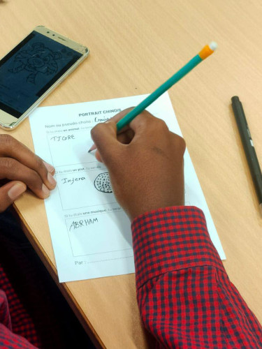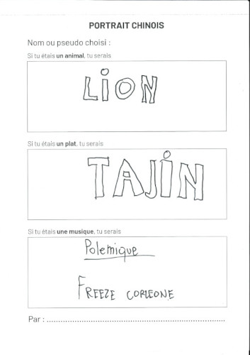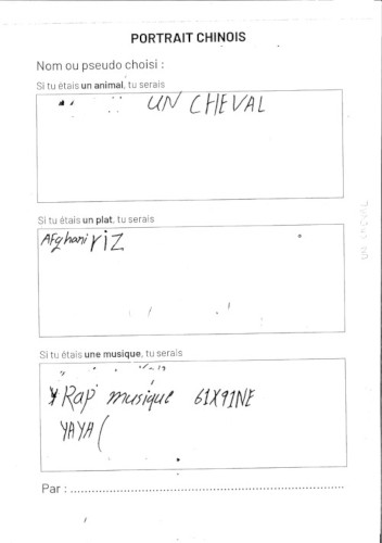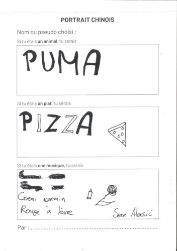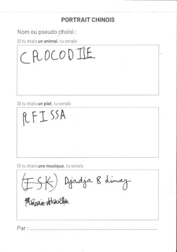 Durant cet atelier, les participants se sont dessinés entre eux. Pour y parvenir, ils bénéficiaient d’un dispositif leur permettant de visualiser le visage de leur camarade. Ils ont également créé leur portrait chinois, en complétant une feuille sur laquelle il devait s’imaginer en tant qu’animal, plat et musique.