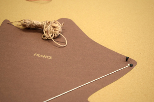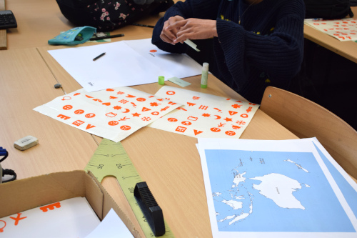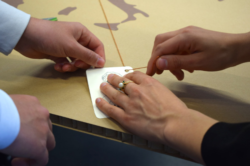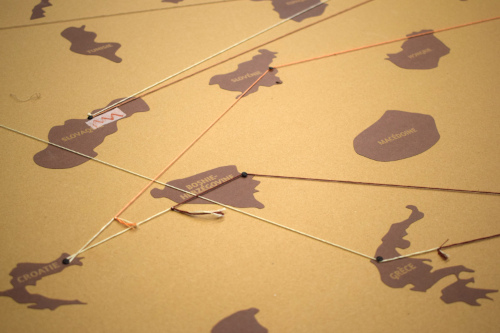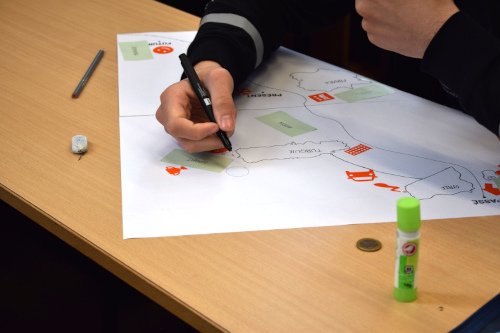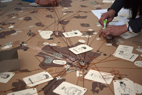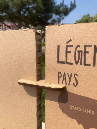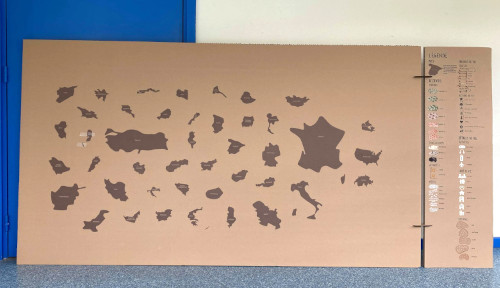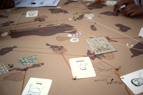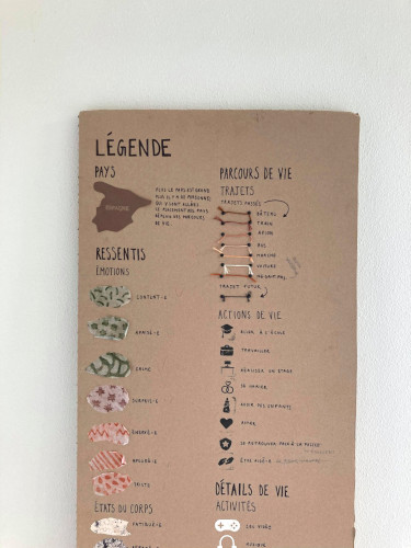 Nous avons ensuite créé la carte ensemble. Pour y parvenir, j’ai d’abord présenté aux participants le support d’intervention, soit un grand carton avec les pays collés dessus, dont la position dépend du parcours de vie des participants, et la taille, du nombre de personnes qui y sont allées. J’ai aussi présenté la légende. J’ai ensuite distribué une légende en papier à chaque personne. Nous l’avons lu ensemble et nous avons expliqué le vocabulaire. Pour finir, nous sommes intervenus sur la carte, en traçant les parcours avec des fils, en accrochant les étiquettes et en collant les différents figurés.