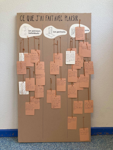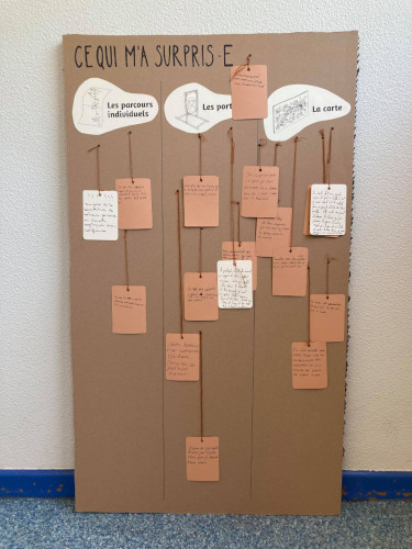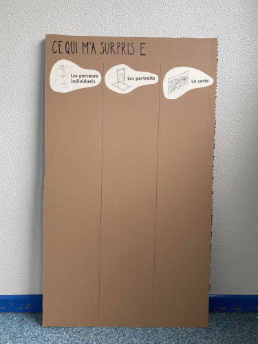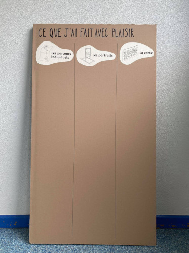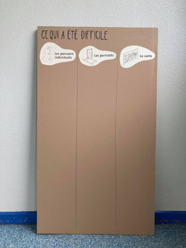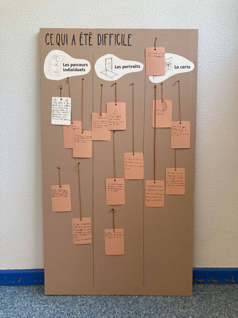 Pour y parvenir, j’ai induit des débuts de phrase orientant la récolte de leur avis, qui sont : “ce qui m’a fait plaisir”, “ce qui m’a surpris” et “ce qui a été difficile”. Les participants ont aussi situé leurs avis selon différents moments du projet : l’étape des parcours individuels, l’étape des portraits et l’étape de la réalisation de la carte.