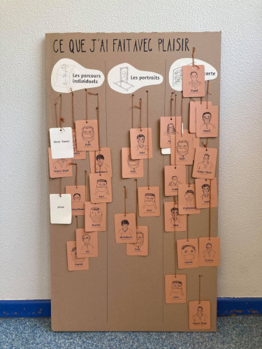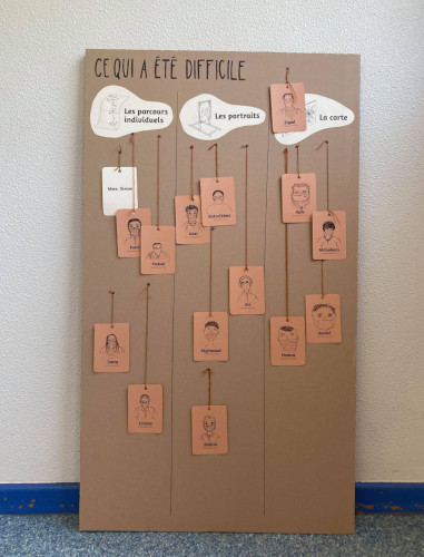 Ce qui en ressort est que ce projet a globalement plu aux participants. Ils ont aimé parlé de leur histoire passée en racontant leur parcours. Ils ont ainsi pu exprimer leur individualité par le récit de leur vie. Pour certains, cela leur a rappelé des souvenirs. Ils ont également apprécié réaliser ce travail collectivement et découvrir les parcours des autres. Imaginer leur futur leur a permis de se projeter pour plus tard, ce qui les a aidé à penser à leur avenir. Ils ont trouvé ce travail amusant, surtout au moment des portraits entre eux et de la réalisation de la carte. Une partie des participants a apprécié utiliser le matériel à sa disposition, soit les fils, les clous et la légende. Par ailleurs, durant ce projet, ils ont fait de nombreuses choses qu’ils n’avaient jamais faites avant, comme se dessiner entre eux, réaliser un portrait chinois, tirer des fils et les clouer pour tracer un parcours. Certaines personnes ont rencontré des difficultés pour s’exprimer dans le projet : ils ont peur de faire des fautes d’orthographes ou n’aiment pas dessiner. D’autres ont eu du mal à parler de leur parcours : c’est difficile de résumer cela avec des mots et parfois c’est trop intime pour être partagé. Pour finir, une élève trouve qu’il n’y a pas assez de place pour tout le monde sur la carte.