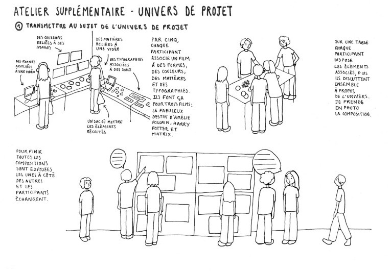 Pour pallier ce manque, j’ai donc pensé à un atelier que j’aurais pu mettre en place permettant aux participants de définir l’univers de la carte. Cet atelier débute par une étape de sensibilisation sur ce qui fait l’univers d’un projet. Par groupe de cinq, chaque participant regarde des vidéos, des images et écoute des extraits d’un film parmi trois, aux univers bien définis. Ces films sont “Matrix”, “Harry Potter” et “Le fabuleux destin d’Amélie Poulain”. Ensuite, il doivent associer ce film à des formes, des couleurs, des matières et des typographies. Ils disposent tous ces éléments sur une table et leur composition est prise en photo. Ils font ça pour les trois films. Ensuite, ces images sont imprimées et exposées. Les participants les regardent et échangent à propos des univers de chaque groupe. Ils font la même chose pour l’univers de la carte. Ils analysent d’abord les parcours individuel et les étiquettes qui ont été réalisées. Puis, ils définissent un univers pour le projet, en choisissant des formes, des couleurs, des textures et des typographies. Des photographies de chaque composition sont exposées et les participants échangent à ce propos pour choisir un univers de carte final. Si le consensus n’est pas possible, alors cet univers est tiré au sort.