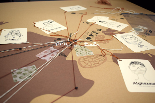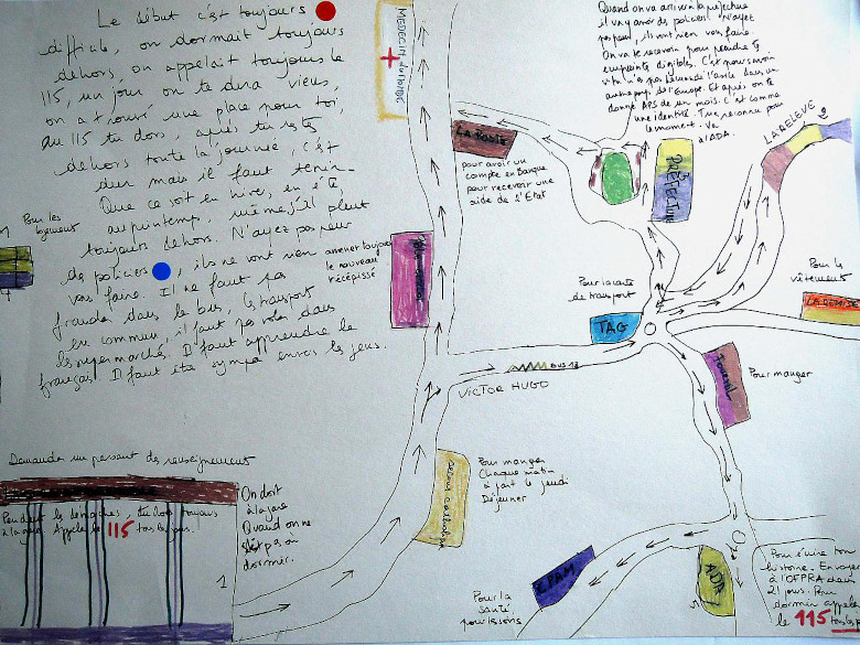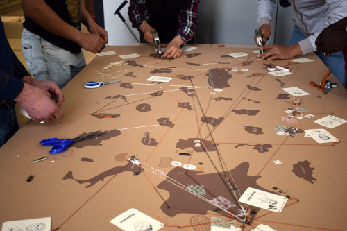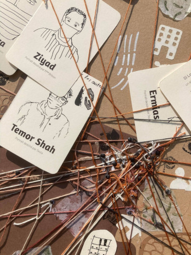 Suite à cette demande, j’ai ainsi pensé à un projet inspiré de “Cartographie traverses”, une initiative réalisée par douze demandeurs d’asile, deux chercheurs en géographie et quatre artistes. Ensemble, ils avaient pour objectif de présenter la migration, ainsi que les politiques liées, dans toute leur complexité. Pour y parvenir, ils ont réalisé différentes cartes sensibles en papier, en tissus, en argile ou à partir de bandes sonores, permettant à chaque demandeur d’asile de s’exprimer sur son expérience migratoire.