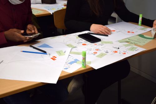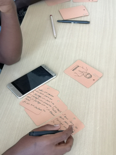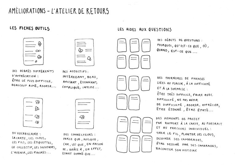 Durant cet atelier, les participants étaient libres d’écrire ce qu’ils souhaitaient, ce qui est intéressant car ça m’a permis d’obtenir des témoignages divers. En revanche, j’ai constaté que ces personnes, qui apprennent le français, ont du mal à exprimer ce qu’ils pensent à l’écrit. Il aurait donc pu être intéressant de mettre à leur disposition des fiches outils, créées avec la professeure de français, pour les aider à construire leurs phrases. Ensuite, cet atelier aurait pu être complété d’un moment d’interview, ou les participants s’aident de cartes pour rédiger cinq questions sur le projet. Ils les posent ensuite à leur camarade et enregistrent leur réponse. Aux termes de cette activité, j’aurais ainsi disposé des opinions écrites, des questions rédigées et des enregistrements, pour consulter leur avis.
