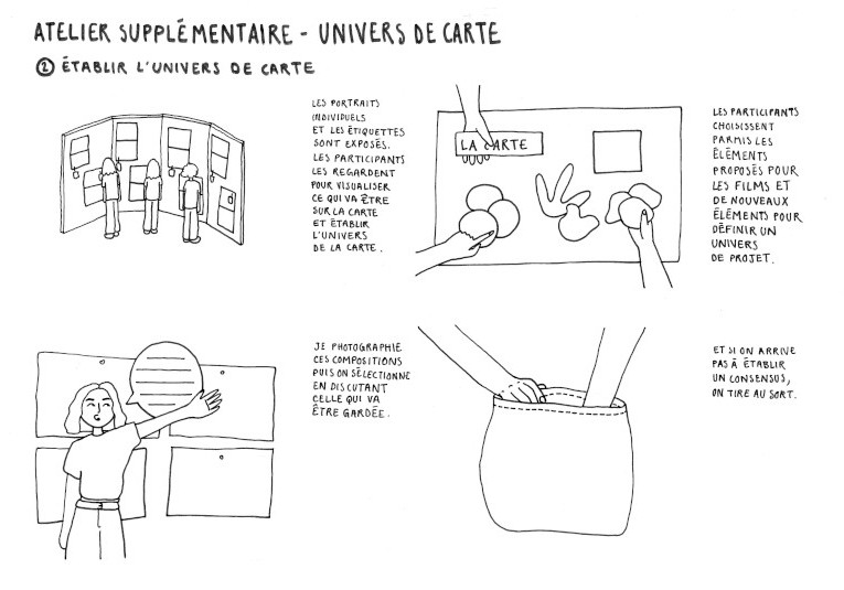 La réalisation de ce projet m’a surtout permis de m’outiller vis-à-vis de la mise en place de projets collaboratifs, où la forme du projet n’est pas définie dès le départ, mais s’établit avec les usagers grâce à des dispositifs leur permettant de formuler leurs idées. Je me rends donc compte que, pour que mes ateliers soient des ateliers en design participatif, il aurait fallu qu’ils permettent aux participants d’intervenir dans l’élaboration du projet, comme pour le projet “Faites la place”, le projet “Kimo” et mon hypothèse d’atelier vis-à-vis de l’univers de la carte.