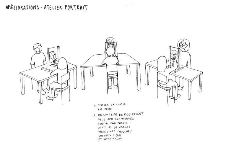 Au cours de cet atelier, ceux qui dessinent le mieux ont principalement réalisé les portraits des autres, ce qui crée des série de portraits du même style. Il aurait pu être intéressant que chaque élève dessine pour obtenir des productions plus variées. Pour induire cette diversité, la classe aurait pu être divisée en deux, entre les élèves dessinant et ceux dessiné, et un système de roulement aurait pu être instauré, afin que chaque élève conçoive une partie du visage de l’autre. Une personne aurait ainsi dessiné une partie du visage d’un de ses camarades, comme le contour du visage, il se serait ensuite déplacé et aurait dessiné les yeux d’une autre personne. Ce processus se répéterait pour le dessin du nez, de la bouche, des cheveux, du cou et des vêtements.