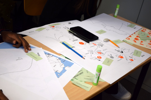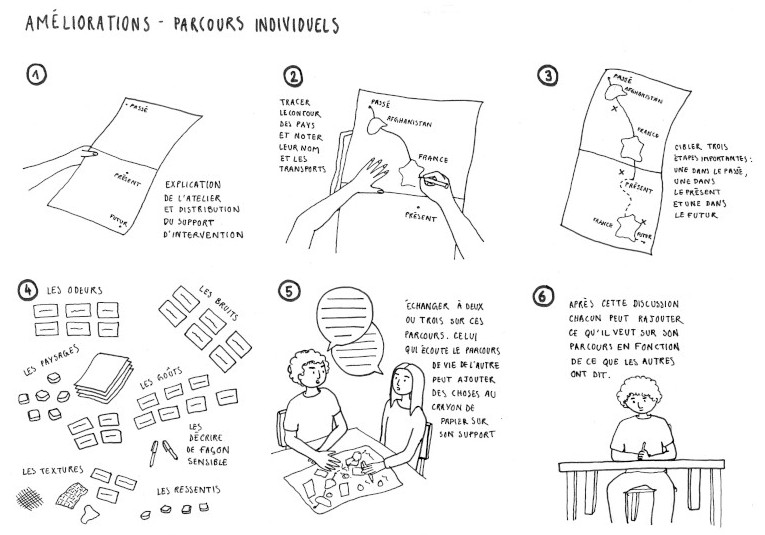Le premier atelier consiste à ce que chaque participant présente, sur une feuille, son parcours individuel. Il part ainsi de sa naissance, pour aller jusqu’à sa situation actuelle et se projette dans le futur. Il doit tracer son cheminement de vie, en faisant les contours et en notant les pays par lesquels il est passé. Il doit également cibler des étapes marquantes de son trajet et les détailler par différents autocollants, des mots clés, des phrases et des dessins. Chaque personne choisit ce dont il souhaite parler et de la façon dont il veut l’aborder.