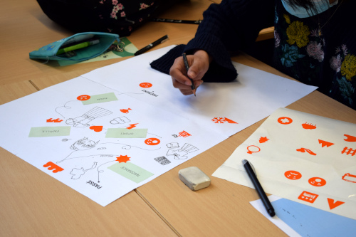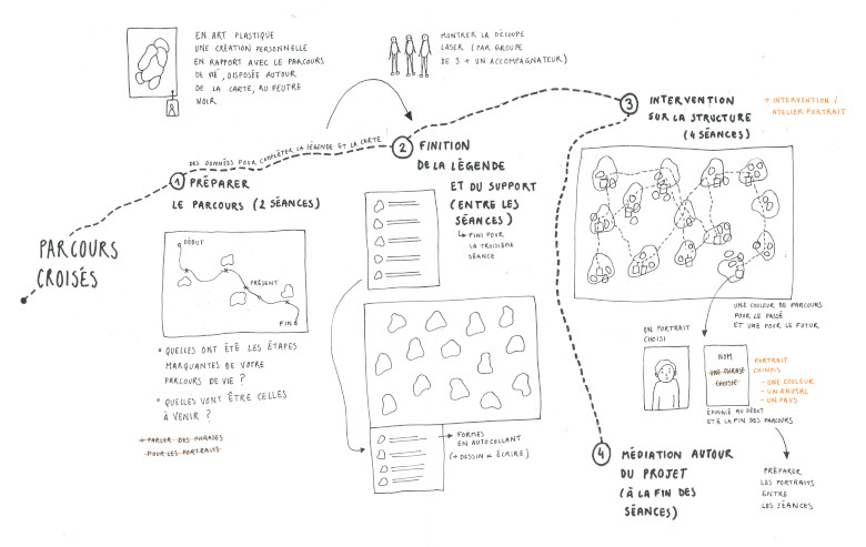 J’ai donc imaginé un projet où chaque participant présente son parcours de vie passé et futur de façon sensible sur un même support. Différents ateliers participatifs rythment le déroulement du projet. Ce sont ces ateliers qui m’ont permis d’expérimenter des outils et des méthodes de design participatif.