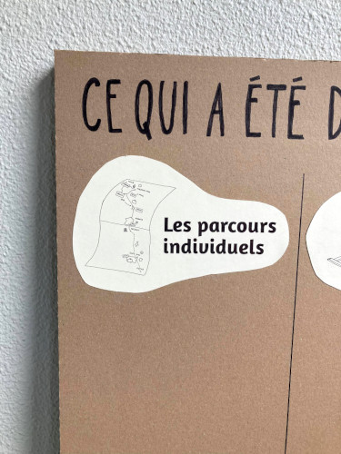 Suite à cet atelier, j’ai constaté que les étapes de vie présentées par les participants pouvaient être plus détaillées. Pour cela, ces derniers auraient pu cibler trois étapes de leur parcours, une dans le passé, une dans le présent et une dans le futur, et les expliquer par les sens, en décrivant des odeurs, des bruits, des paysages, des goûts, des textures ou des ressentis. Ensuite, ils auraient pu échanger à deux ou trois sur leur parcours, se questionner et ajouter des éléments sur leur support. Pour y parvenir, ils auraient pu bénéficier de mots écrits sur du papier, de textures, de tampons ou de feuilles de couleur.