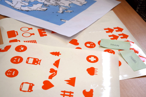 Pour réaliser cette activité, les participants bénéficient d’une feuille A2 avec trois points dessus : “passé”, “présent”, “futur”. Ils ont aussi des autocollants présentant des pictogrammes. Les pictogrammes utilisés ont été trouvés sur le site thenounproject.com. Certains ont été légèrement modifiés. Ils peuvent également utiliser des papiers avec des mots clés dessus, des parties du monde pour décalquer les contours des pays et des feutres noirs pour tracer leur parcours, écrire ou dessiner.