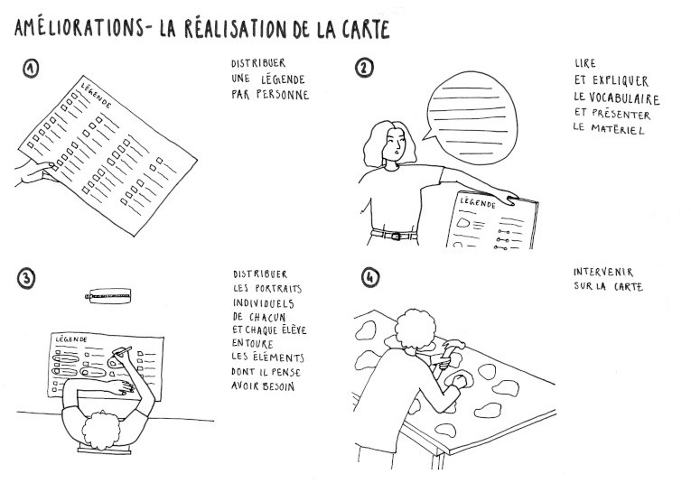 En faisant intervenir directement les participants sur la carte après la lecture de la légende, ces derniers n’ont pas toujours porté une grande attention au sens des figurés. Ils se sont davantage concentrés sur le symbole de chaque forme. Par ailleurs, il n’ont pas utilisé leur parcours individuel. Il aurait pu être intéressant de changer le déroulement de cet atelier. Après avoir expliqué le vocabulaire de la légende, j’aurais pu distribuer les parcours individuels et faire entourer aux participants, sur leur légende, ce dont ils pensent avoir besoin pour la carte, avant d’intervenir dessus. Ils auraient ainsi fait plus attention au sens des figurés.