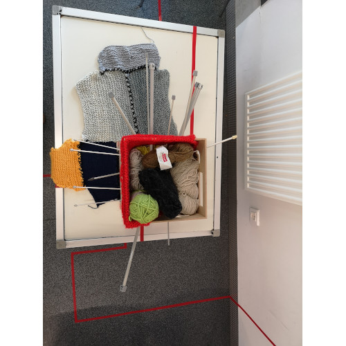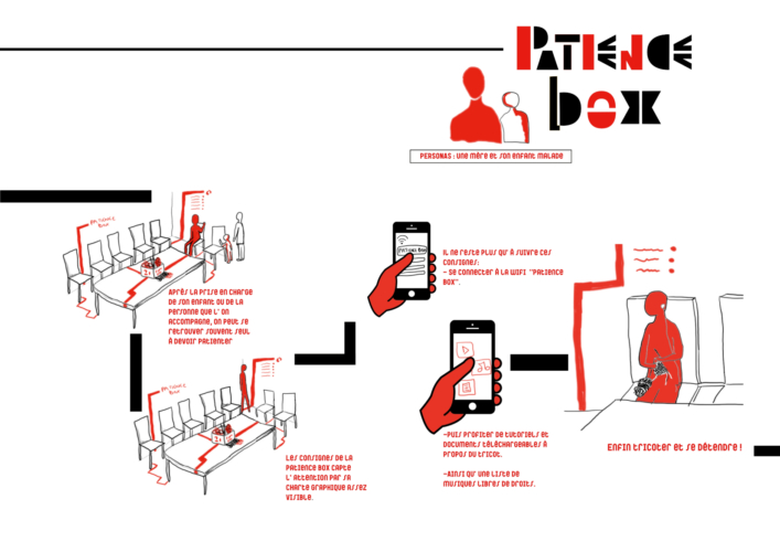 La Patience Box s’inscrit dans cette seconde démarche. Partant d’un projet situé aux urgences, nous avons exploré ces lieux et constaté un milieu ambiant anxiogène. Nous jugeons alors utile de fournir un contenu thérapeutique à des personnes contraintes d’attendre aux urgences, souvent soumises à des souffrances psychiques ou physiques. Ce projet se centre autour du tricot, activité connue pour ses vertus apaisantes.