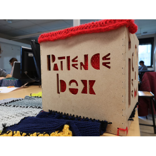Sa communication cherche à ce que les usagers de la patience box s’ouvrent au projet. C’est pourquoi nous avons pensé à la conception d’une boîte cubique et imposante, installée au centre de la table de la salle d’attente. Celle-ci doit contenir les aiguilles et pelotes de laine nécessaires. L’extérieur est en bois, pour lui permettre rigidité et solidité. L’intérieur est en laine tricotée afin d’évoquer douceur, chaleur et apaisement. Elle dispose d’un système d’accrochage : chaque patient ayant fini son tricot peut participer à l’œuvre commune d’une large couverture en patchwork.