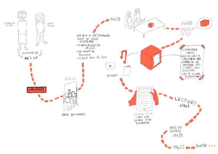 Ce dispositif n’a pas été testé aux urgences. Notre projet devant se réaliser sur une durée de 6 semaines, les délais étaient trop courts pour développer un partenariat avec une instance publique contrainte par le secret médical. C’est donc au sein de notre école, en retranscrivant l’atmosphère d’une salle d’attente, que nous l’avons expérimenté.