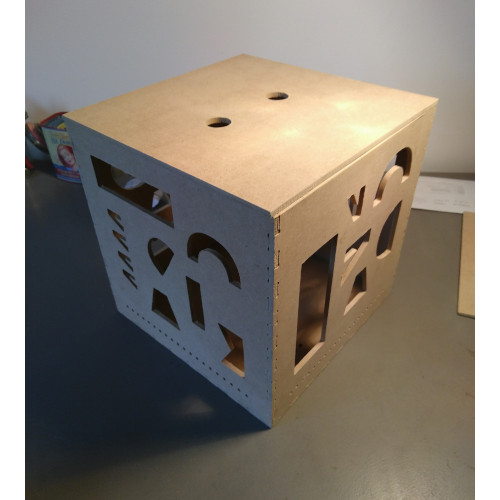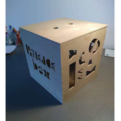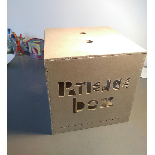 Sa communication cherche à ce que les usagers de la patience box s’ouvrent au projet. C’est pourquoi nous avons pensé à la conception d’une boîte cubique et imposante, installée au centre de la table de la salle d’attente. Celle-ci doit contenir les aiguilles et pelotes de laine nécessaires. L’extérieur est en bois, pour lui permettre rigidité et solidité. L’intérieur est en laine tricotée afin d’évoquer douceur, chaleur et apaisement. Elle dispose d’un système d’accrochage : chaque patient ayant fini son tricot peut participer à l’œuvre commune d’une large couverture en patchwork.